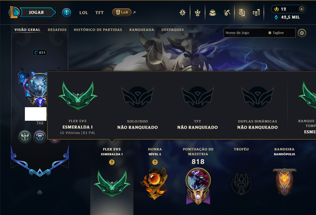 ( TOP / JG / SUP ) - ( Nivel 831 ) - Conta Unranked om TODOS os Champs, Maestria 37 de ChoGath, 36 de Yorick, 22 de Malphite, 19 de Mordekaiser, 18 de Sion, 50 Maestrias acima de 7, 245 Skins, 2 Miticas, 9 Vitoriosas, 42k de EA, 156 Cromas, 374 Ícones, 277 Emotes, 35 Essencias Miticas e Honra 5.